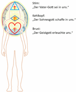 Der obige Mensch zeigt, was bereits Welt geworden ist. Gibt es darin integriert einen Raum des Neu-Werdens? In der Christengemeinschaft wird die Bekreuzigung an drei verschiedenen Körperstellen durchgeführt: an der Stirne, in der Sprachregion (Mund, Kinn, Kehlkopf) und auf der Brust. Diese Orte werden mit je einem Gott der Dreifaltigkeit verbunden.