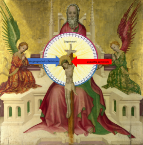 Und dann arbeitete es weiter in mir. Ist es vielleicht denkbar, dass die beiden Zeitströme, von denen Rudolf Steiner spricht, beide aus dieser Ewigkeit hervorgehen? Sind sie vielleicht die Arme Gottes, mit denen er die Welt hält und die Gegenwart erschafft? Als ich soweit war, fiel mir auf, dass es diesen Bild-Typ bereits seit dem Mittelalter gibt. Bilder von Gottvater, der das Kreuz mit dem Gekreuzigten hält, werden „Gnadenstuhl“ genannt. Die Taube vervollkommnet das Bild der Dreifaltigkeit.