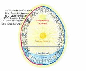 Es ist der Astralleib, der nach Sin­nes­reizen hungert und dürstet. Er sendet durch die Sinne Licht­strahlen voller Welt­in­ter­esse nach außen. Damit ‘nährt´ er sich und ermöglicht Bewusst­sein. Die Seele braucht die Anre­gung aus der Sinneswelt, um sich lebendig zu fühlen und Selb­st­be­wusst­sein zu entwick­eln. Diese Unter­schei­dung und Abgren­zung von Innen und Außen ermöglicht es dem Ich, in der Seele zu wirken. Das Mantra 23 W beschreibt die See­len­stim­mung, in der das Ich als neue Kraft in der Seele begin­nt zu wirken, d.h., wenn sich das Ich darin zur Gel­tung bringt und begin­nt, sich zu entwickeln.